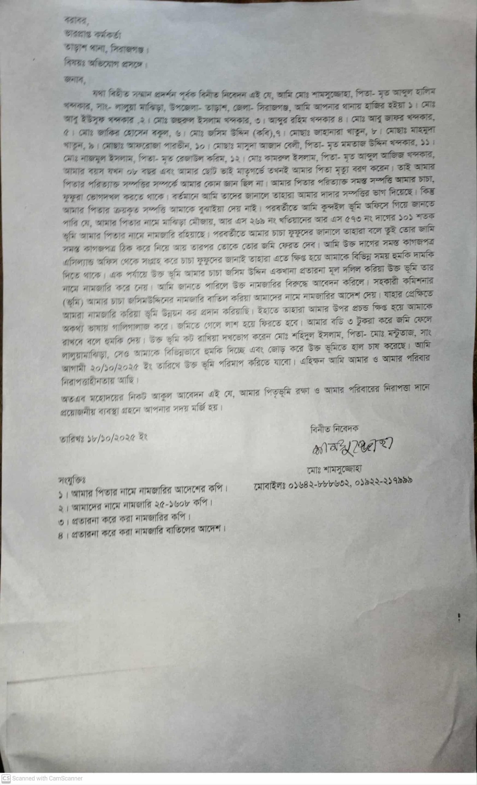 অভিযোগে আরও বলা হয়, স্থানীয় শহিদুল ইসলাম নামের এক ব্যক্তি ওই জমিতে জোরপূর্বক হাল চাষও করেছেন। আগামী ২০ অক্টোবর জমি পরিমাপ করতে গেলে শামসুজ্জোহা ও তার পরিবার নিরাপত্তাহীনতায় ভুগছেন বলে তিনি জানিয়েছেন।