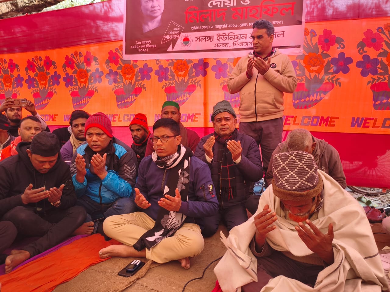 মঙ্গলবার (৬ জানুয়ারী) বিকাল সাড়ে ৪ ঘটিকায় সলঙ্গা থানার সদস্থ গরু হাট সংলগ্ন মাঠ প্রাঙ্গনে বাংলাদেশ জাতীয়তাবাদী সলঙ্গা ইউনিয়ন শ্রমিকদলের আয়োজনে এ দোয়া মাহফিল অনুষ্ঠিত হয়। এসময় সলঙ্গা ইউনিয়ন শ্রমিকদলের সভাপতি নূরনবী শিকদারের সভাপতিত্বে ও সাধারণ সম্পাদক তারেক মাহমুদের সঞ্চালনায় প্রধান অতিথি হিসেবে উপস্থিত ছিলেন সলঙ্গা থানা বিএনপির সাবেক সভাপতি মতিয়ার রহমান সরকার ও বিশেষ অতিথি হিসেবে উপস্থিত ছিলেন সলঙ্গা থানা শ্রমিকদলের সভাপতি আহসান হাবীব।
